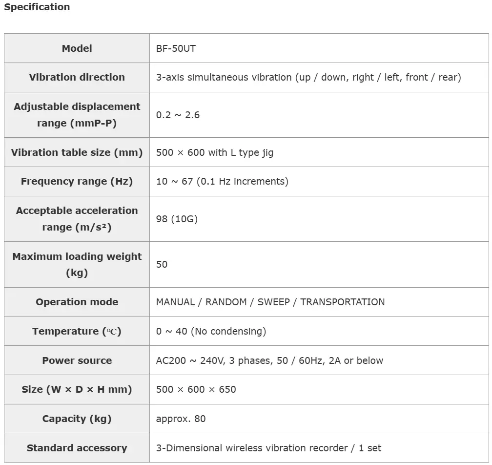 BF-50UT is able to reproduce the 3-axis (X・Y・Z) simulta-neous vibration similar to real transportation conditions and simulate left-right turns by a truck. It only takes 20 minutes to reproduce conditions equivalent to distances of 1000km by truck. Up to 50kg load capacity can be evaluat-ed. This tester is suitable for reproducing the rubbing of outer packaging or contents during transportation.